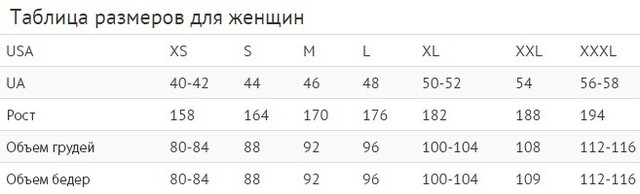 | Розмір одягу жіночий | 44, 46, 48, 50, 52 |